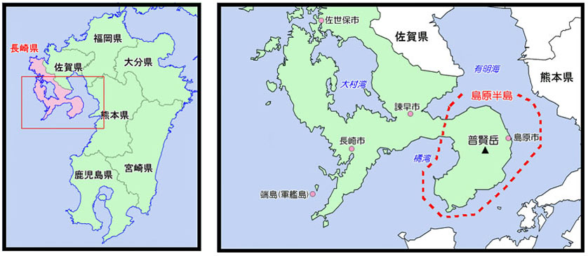 1792年(寛政4年)島原地方を火山性の大地震が襲い、島原西側の眉山東側部分で山体崩壊が起こりました。この山体崩壊により大量の土砂が有明海に流れ込み、海岸線は800mも海側に移動し、海に崩落した土砂により高さ13mにも及ぶ大津波が発生し、対岸の肥後国(熊本県)に押し寄せました。その津波は対岸の熊本県側と島原の間を3往復したそうで、「島原大変、肥後迷惑」として知られる未曾有の大災害となり、15,000人が亡くなったそうです。