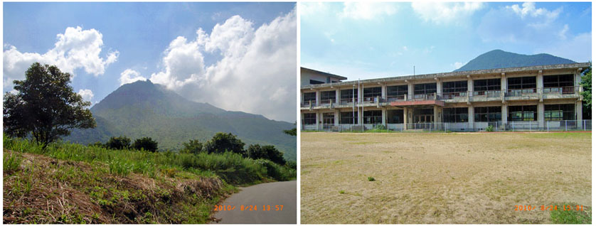 大野木場小学校の校舎は被災した状態のまま保存されており、今でも火砕流の痕跡を見ることができます。火砕流の威力は凄まじく、水無川に面した校舎東側の窓ガラスは砕け散り、西側からも回り込んだ火砕流が入り込み、熱風により校内はほとんど焼けてしまいました。焼けてコンクリートの基礎だけになった廊下、熱によって歪んだ窓枠、教室内の机が散乱した状況を見るとその威力に驚かされます。 |